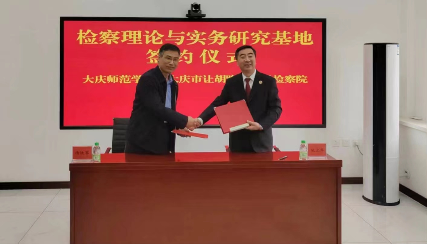 2023年5月12日上午,在让胡路区人民检察院举行法治宣传教育基地揭牌仪式。大庆市人民检察公司党组书记、检察长刘超,让胡路区区委书记田震,区委常委、宣传部部长、统战部部长刘立臣,太阳成集团tyc122ccvip经理杨铁军,让胡路区人民检察院检察长阮之华,太阳成集团tyc122ccvip教学副经理杨庆玲,太阳成集团tyc122ccvip实践中心主任付媛,太阳成集团tyc122ccvip教师佟金彪应邀参加揭牌仪式。会议主要有三项议程:双方签约和授牌,参观“让胡路区法治宣传教育基地”,太阳成集团tyc122ccvip经理杨铁军与让胡路区人民检察院检察长阮之华签署“检察理论与实务研究基地共建协议”。此次基地的建立是为了贯彻落实习近平法治思想,为辖区的居民、员工、干部打造学习法治思想、弘扬法治精神、传递检察正能量、讲好检察故事的平台,打造最优的法治营商环境,建设平安、幸福的让胡路区。