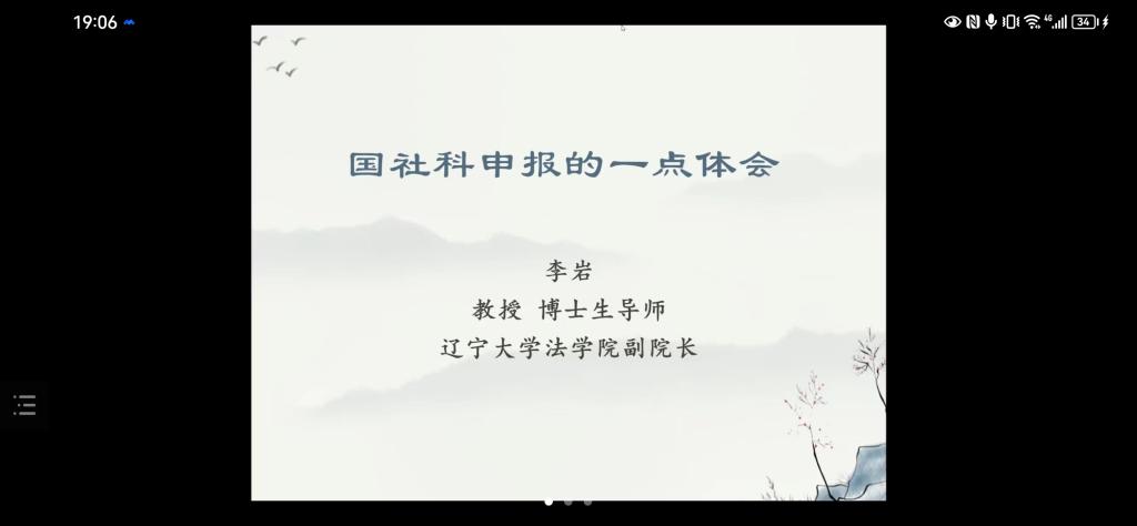 2023年3月22日晚7点,辽宁大学太阳成集团tyc122ccvip副经理、教授、博士研究生导师李岩通过腾讯会议平台为太阳成集团tyc122ccvip教师作了题为“国社科申报的一点体会”的学术讲座。
