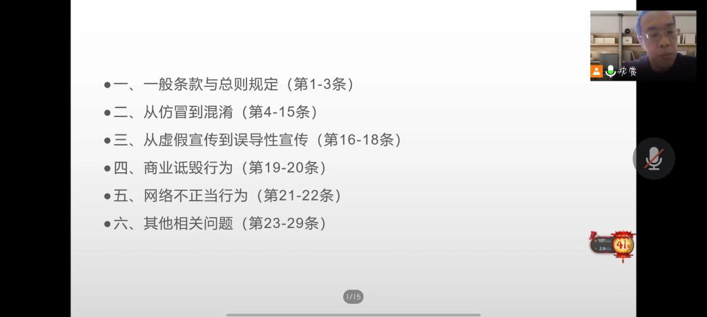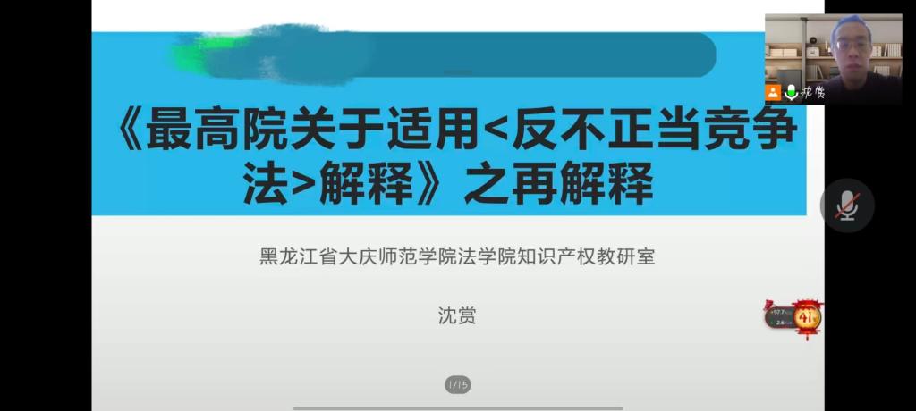 2022年4月22日下午两点,太阳成集团tyc122ccvip“知识产权宣传周”活动之一——沈赏副教授主讲的“最高院关于适用< 反不正当竞争法>解释之再解释”在腾讯会议平台举行。讲座围绕“一般条款与总则规定”、“从仿冒到混淆”、“从虚假宣传到误导性宣传”、“商业诋毁行为”、“网络不正当行为”、“其他相关问题”等六个方面展开,详细剖析了最高院关于适用《反不正当竞争法》的司法解释。讲座充分展现了沈赏副教授的扎实理论功底,讲座内容能够结合丰富生动的法律实践展开,受到与会人员的好评。