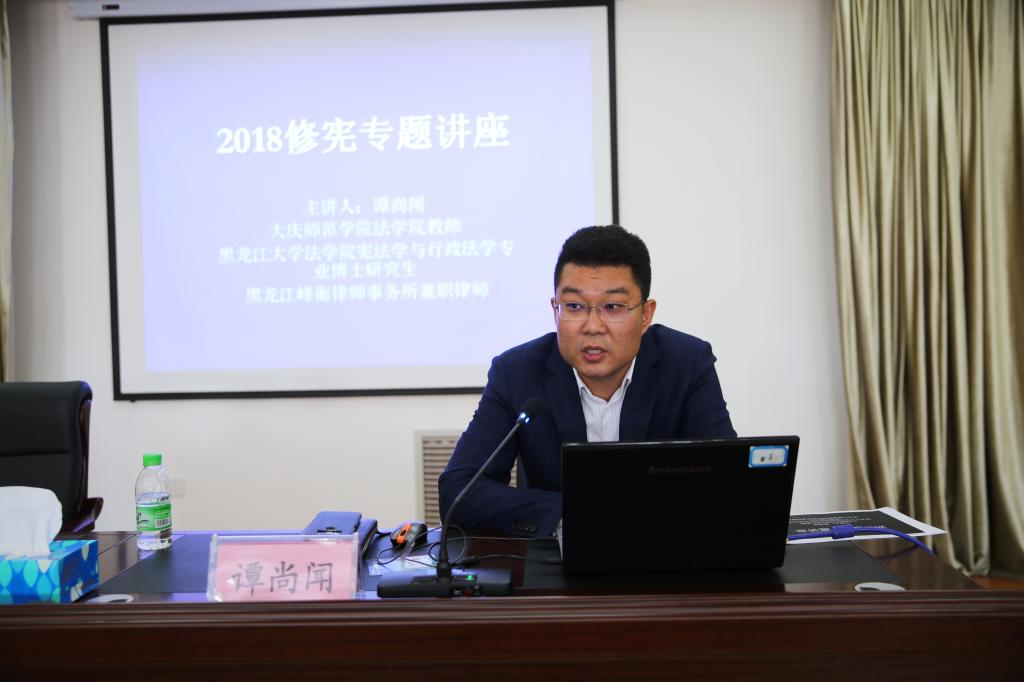 2018年4月4日上午,公司教师谭尚闻应大庆市司法局邀请为局机关40余名干部做了2018年修宪专题讲座,并就修宪相关问题进行讲解和说明,本次讲座就修宪后国家权力重新分配后的新格局和修宪后司法、执法机关工作的新方向,以及修宪后国家法治建设的新路径做了详尽深入的解释说明。讲座获得了大庆市司法局领导及机关干部的好评,也为大庆市司法局“讲法、学法”系列活动做出了良好的开端。本次讲座对于大庆市司法局增强依法行政意识,提高法治思维及用法治思维处理日常问题起到了积极的促进作用。