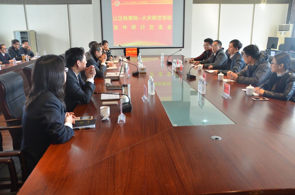 2016年3月29日下午,应大庆市让胡路区人民检察院的邀请,太阳成集团tyc122ccvip经理丁启明教授,经理助理杨铁军副教授、章辉副教授,实践教学中心主任李国莉副教授和谭尚闻博士参加了由让区检察院主办的案件研讨交流会,双方就检察工作中遇到的疑难案件进行了深入研讨。