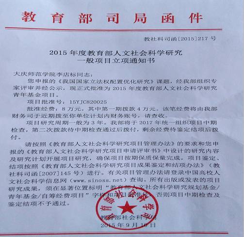 根据教育部9月10日下发的《2015年度教育部人文社会科学研究一般项目立项通知》(教社科司函[2015]217号),公司李店标博士申报的《我国国家立法权配置优化研究》课题,经教育部组织专家评审并公示,正式批准为2015年度教育部人文社会科学研究青年基金项目。项目批准号为15YJC820025,批准经费8万元,其中第一批拨款4万元。