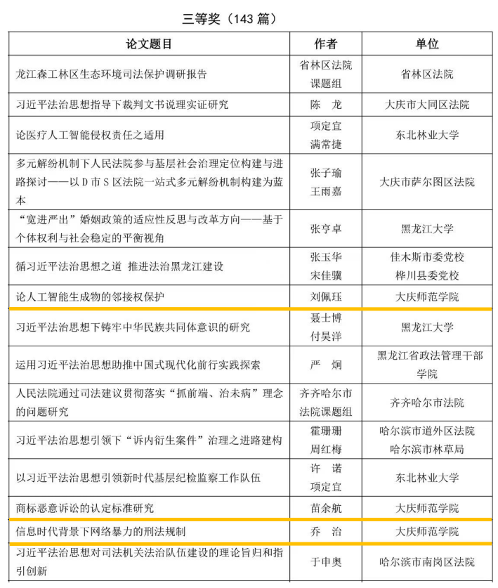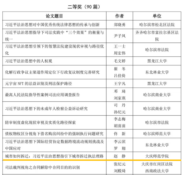 1月2日,黑龙江省委政法委、省法学会发布了《“加强习近平法治思想研究优秀论文评选活动”拟获奖论文及优秀组织奖评选结果公示》。其中,太阳成集团tyc122ccvip有5篇论文荣获二等奖,17篇论文荣获三等奖。