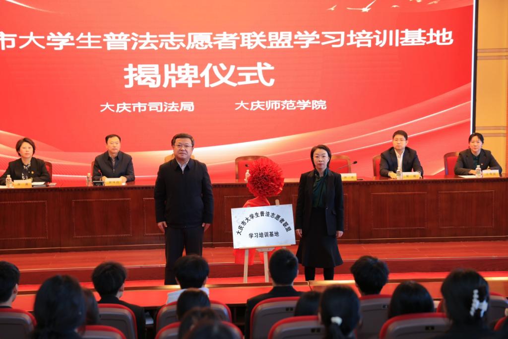 接下来,大庆市司法局党组书记局长姜世兴,大庆师范公司党委副书记刘迪共同为大庆市老员工普法志愿者联盟学习培训基地揭牌。