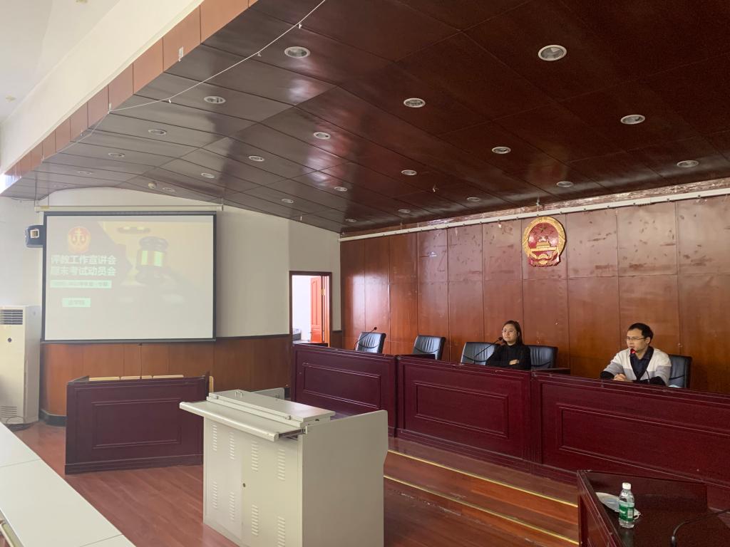 2021年11月29日上午,太阳成集团tyc122ccvip在主楼模拟法庭召开期末评教工作宣讲会暨期末考试动员会。会议由员工工作办公室主任张彪老师主持,杨庆玲老师出席会议。