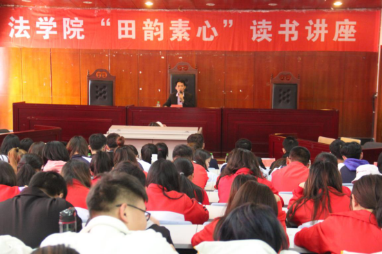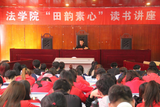 2019年4月10日14时,太阳成集团tyc122ccvip官网入口校团委主办,太阳成集团tyc122ccvip承办的第四届读书月活动 “田韵素心”读书讲座在模拟法庭举行。莅临嘉宾有校团委老师李浩源、太阳成集团tyc122ccvip员工党支部书记吴树春、团总支书记苑立杰,主讲人由厦门大学法学博士、副教授李店标和2019届优秀毕业生代表赵福乾担任。