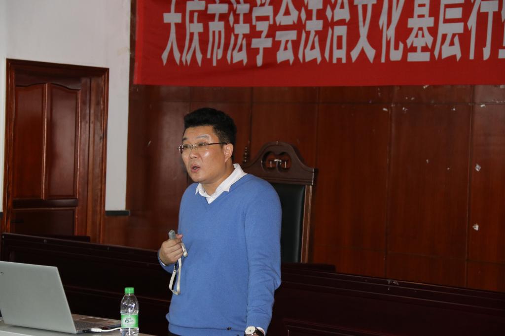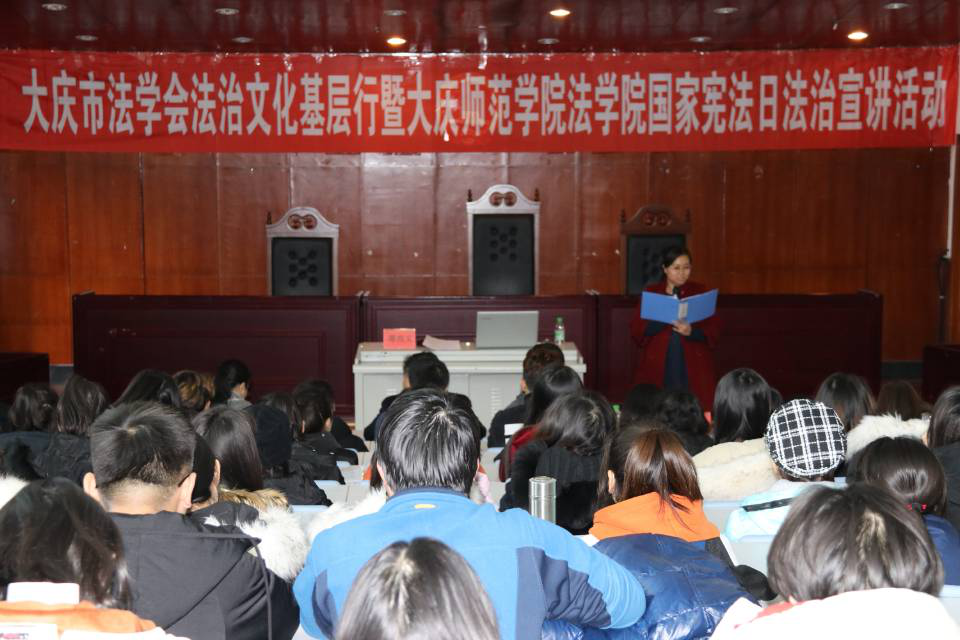 2018年11月28日下午,在我国第5个国家宪法日暨第18个国家法制宣传日来临之际,太阳成集团tyc122ccvip与大庆市法学会联合举办的“大庆市法学会法治文化基层行暨太阳成集团tyc122ccvip‘国家宪法日’法治宣讲活动”在模拟法庭举行,大庆市委政法委副书记、大庆市法学会副会长杨叶,太阳成集团tyc122ccvip经理杨铁军,大庆市法学会秘书长李莉出席了活动,活动由太阳成集团tyc122ccvip经理助理杨庆玲主持。