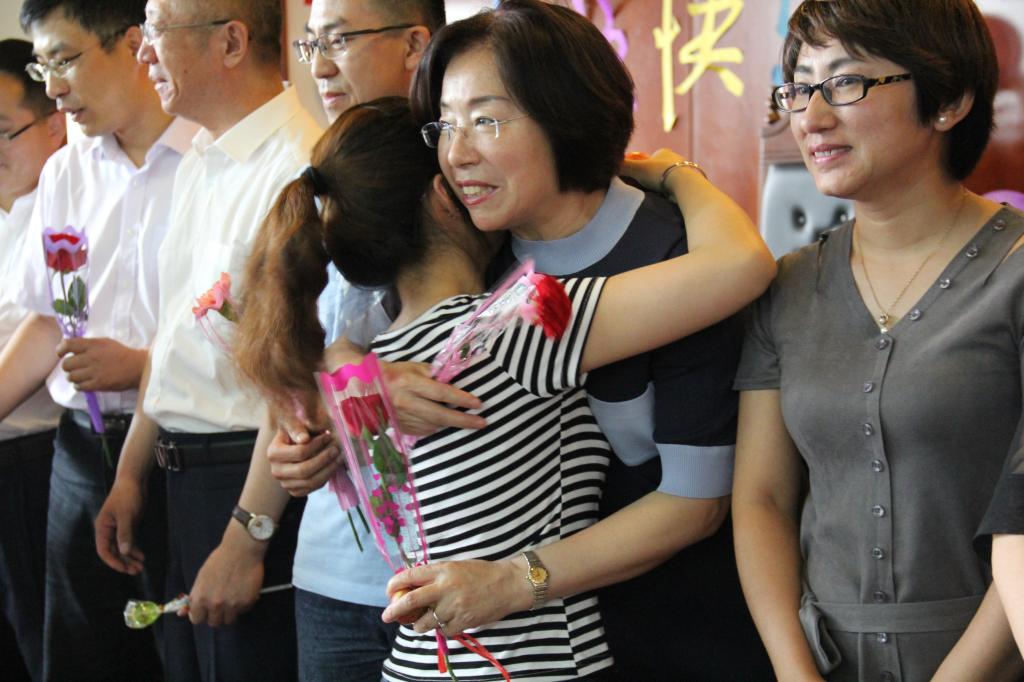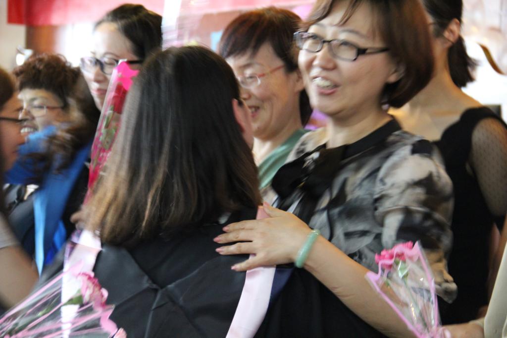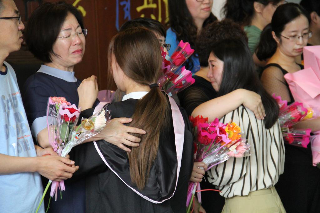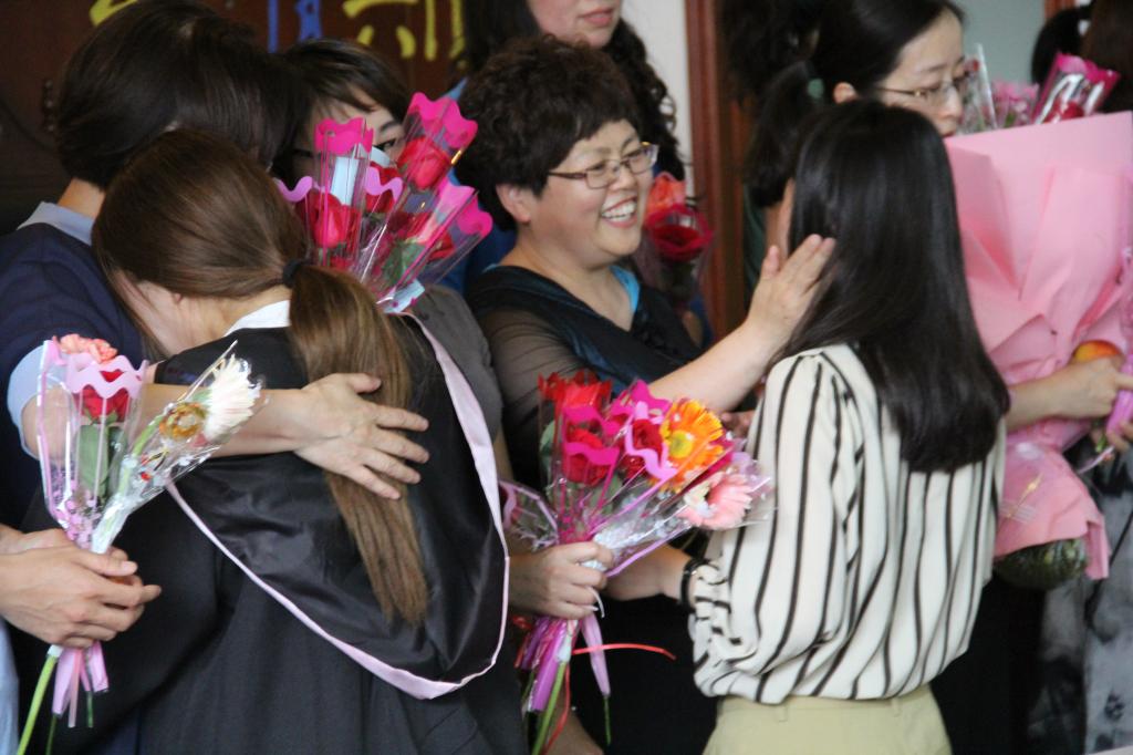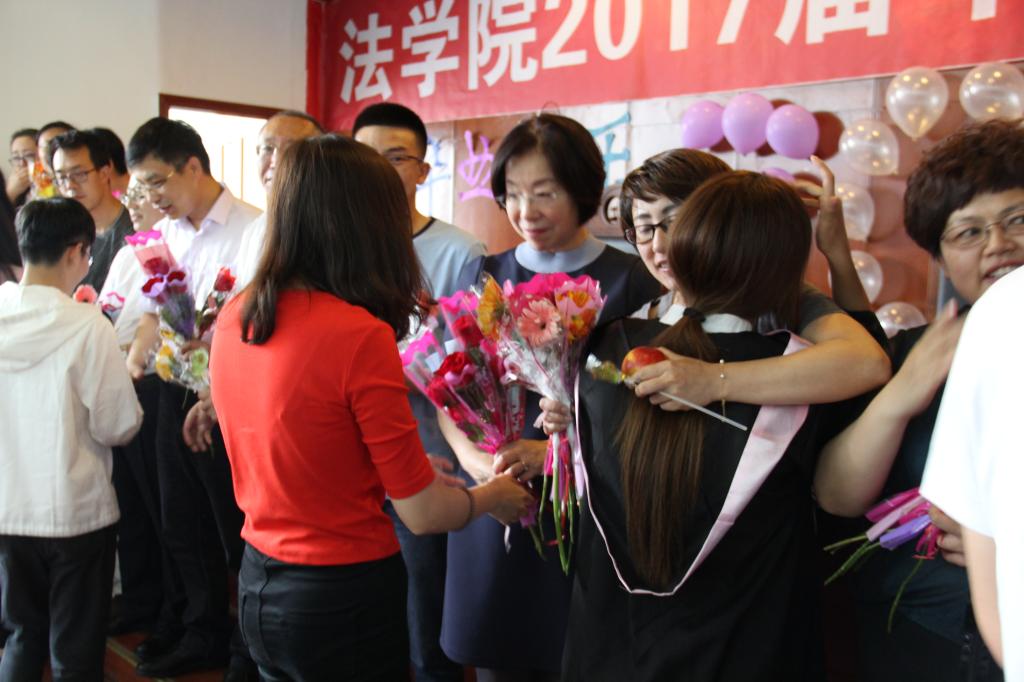 最后,典礼在毕业生与全体教师的依依惜别中落下了帷幕。所有老师站在台前,同学们排队依次同老师握手、拥抱、献花,老师和同学都热泪盈眶,很多同学泣不成声。这泪水凝聚了四年的师生情、同学情,凝聚了同学们对母校的依恋和不舍。四年师友昨日成追忆,千里之行今朝正起航,我们衷心祝福2017届毕业生一路顺风,前程似锦。