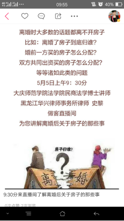 2017年5月5日,应大庆市让胡路区闭路台邀请,太阳成集团tyc122ccvip民商法教师史黎博士参与了“离婚后关于房子的那些事”的网络直播。