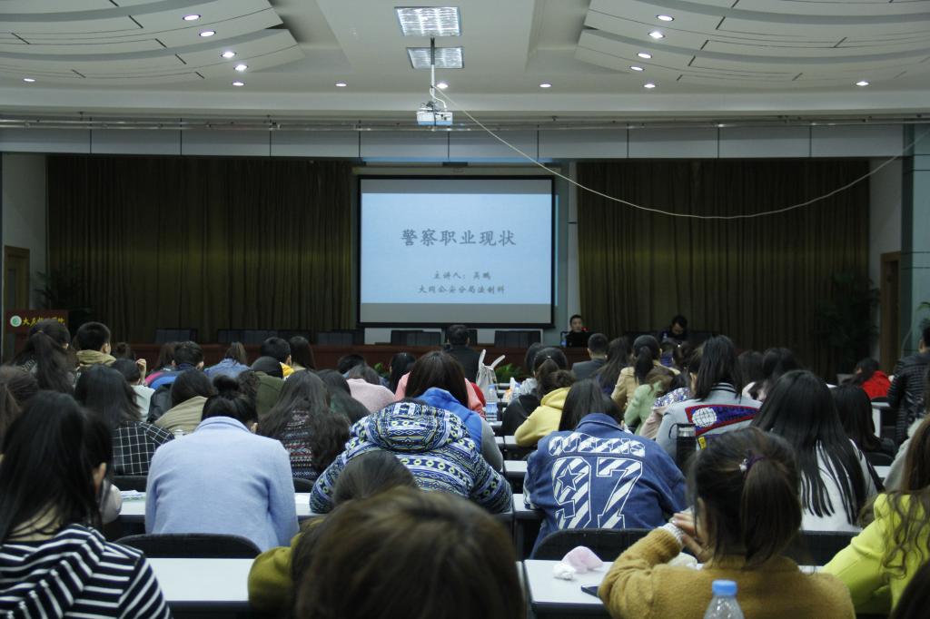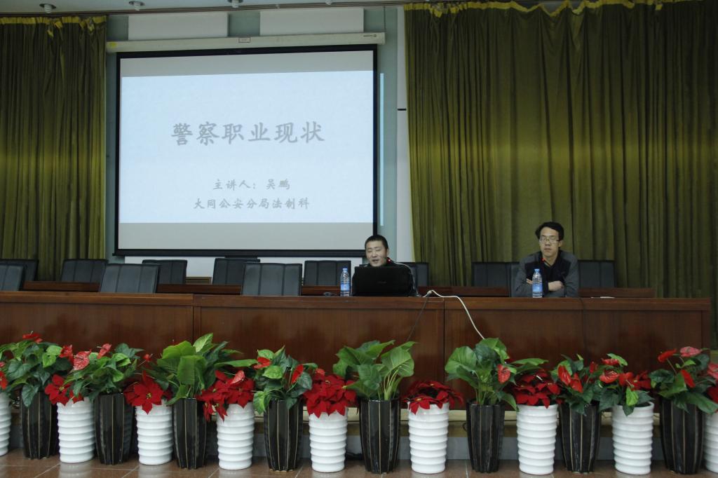 2016年4月22日下午6点在铁人讲堂举办了法庭教学课程的第四场报告会,由大同公安分局法制科吴鹏科长为2013、2014级员工做了题为“警察职业现状”的报告。