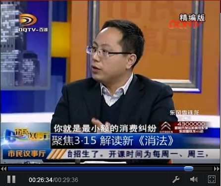 在3.15消费者权益保护日当天,公司经理助理、章辉副教授应大庆电视台市民议事厅栏目组的邀请,作为嘉宾参与了《聚焦3·15解读新< 消法>》的节目直播。章辉副教授就新消法的若干亮点与节目主持人、消协工作人员、执业律师和消费者志愿者进行了深入交流,并结合自身对消费者权益保护法的理解和研究经验,对电信消费领域存在的消费陷阱、新消法规定的特殊消费领域的举证责任倒置、新消法规定的最低赔偿额度等问题进行了深度解读,这对于消费者正确理解和适用新消法保护自己的合法权益具有积极意义。