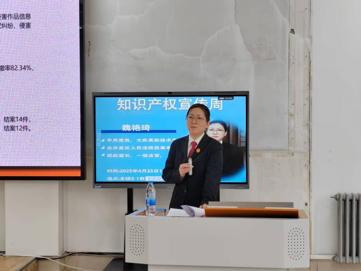 2025年4月25日下午13时30分,大庆高新区法院民庭副庭长、一级法官魏艳琦在主楼2-1为2024级法学专业和2022级知识产权专业同学带来题为《加强知识产权司法保护 为经济社会高质量发展护航》的讲座。