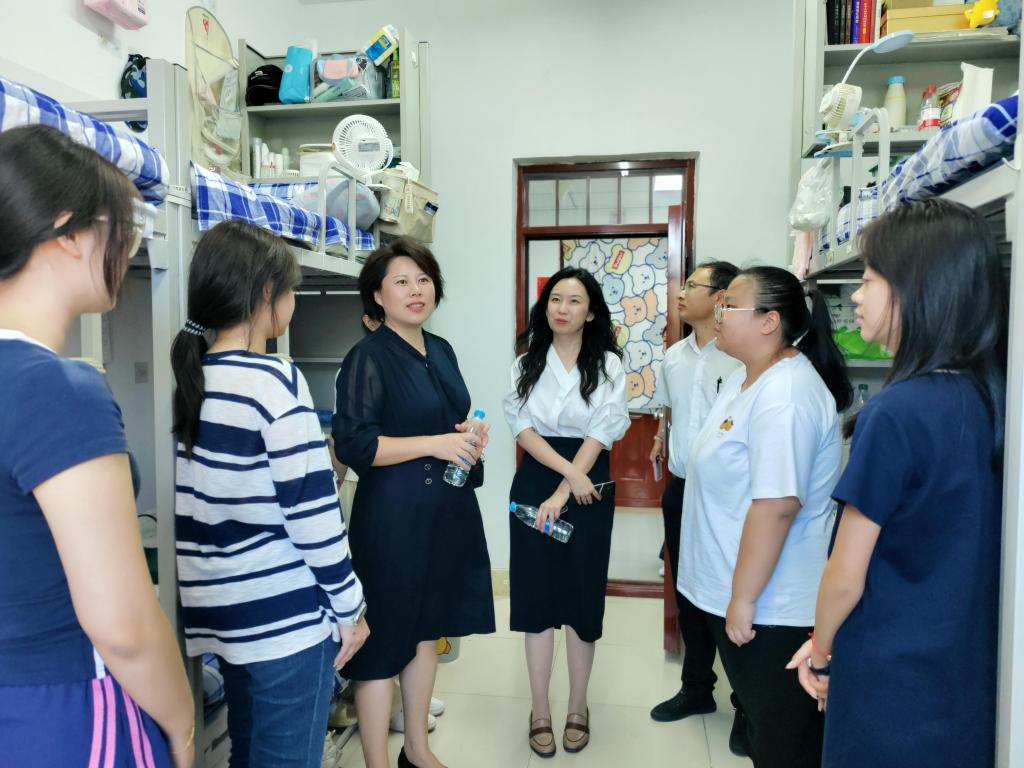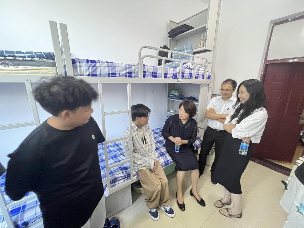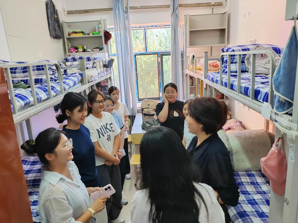 在走访新生寝室时,唐莉书记、杨郁婷和张彪老师与同学们面对面交流,细致询问入住感受和生活需求,勉励新生们快速完成角色转换,主动熟悉校园环境,积极参与校园活动,构建良好人际关系,以青春之姿勇担时代使命。
