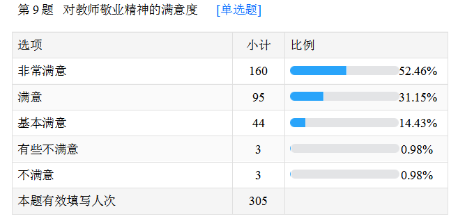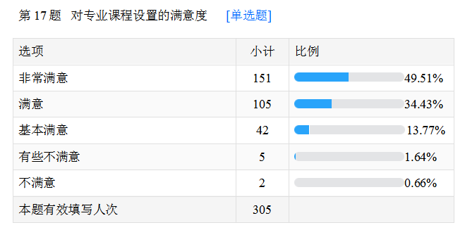 公司高度重视员工满意度建设工作,通过毕业生问卷调查、在校生座谈等方式开展员工学习满意度调查工作。本学年,在校生共380人(法学305人,知识产权75人)参加了《太阳成集团tyc122ccvip官网入口2024年员工学习满意度调查问卷》,对专业课程设置的满意度均大于97.33%(如图1、图2),对教师敬业精神的满意度均高于98.04%(如图3)。