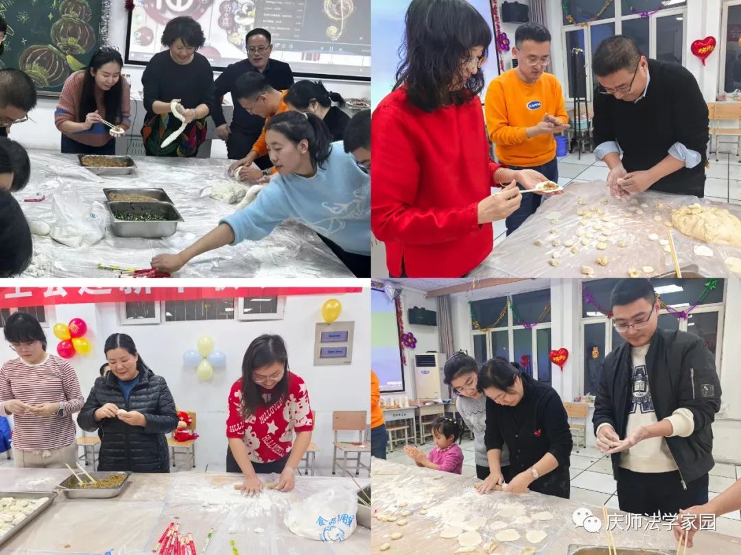 随后,老师们纷纷加入到包饺子的行列中,撸起袖子开始大展自己的手艺,揉剂子、擀皮、各式各样的包法营造出和谐温馨的画面,大家在欢乐的气氛中放松精神,品尝着自己的劳动成果。